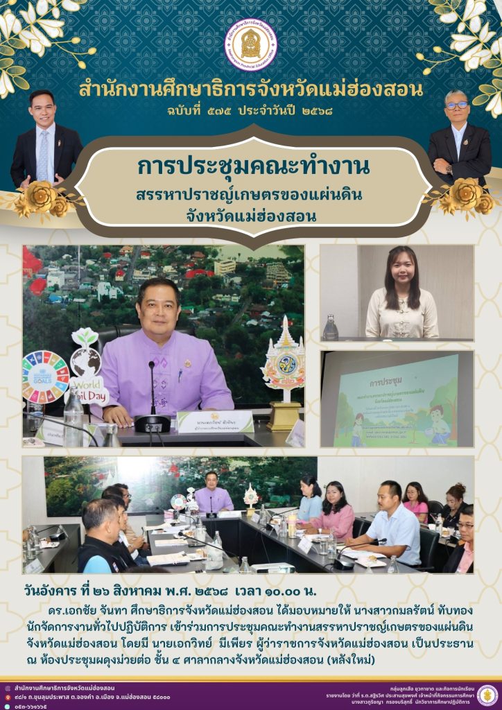 ดร.เอกชัย จันทา ศึกษาธิการจังหวัดแม่ฮ่องสอน ได้มอบหมายให้ นางสาวกมลรัตน์ ทับทอง นักจัดการงานทั่วไปปฏิบัติการ เข้าร่วมการประชุมคณะทำงานสรรหาปราชญ์เกษตรของแผ่นดิน จังหวัดแม่ฮ่องสอน โดยมี นายเอกวิทย์ มีเพียร ผู้ว่าราชการจังหวัดแม่ฮ่องสอน เป็นประธาน ณ ห้องประชุมผดุงม่วยต่อ ชั้น ๔ ศาลากลางจังหวัดแม่ฮ่องสอน (หลังใหม่)