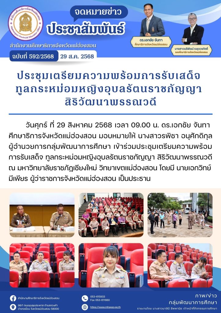 วันศุกร์ ที่ 29 สิงหาคม 2568 เวลา 09.00 น. ดร.เอกชัย จันทา ศึกษาธิการจังหวัดแม่ฮ่องสอน มอบหมายให้ นางสาวรพิชา อนุศักดิกุล ผู้อำนวยการกลุ่มพัฒนาการศึกษา เข้าร่วมประชุมเตรียมความพร้อมการรับเสด็จ ทูลกระหม่อมหญิงอุบลรัตนราชกัญญา สิริวัฒนาพรรณวดี ณ มหาวิทยาลัยราชภัฏเชียงใหม่ วิทยาเขตแม่ฮ่องสอน โดยมี นายเอกวิทย์ มีเพียร ผู้ว่าราชการจังหวัดแม่ฮ่องสอน เป็นประธาน