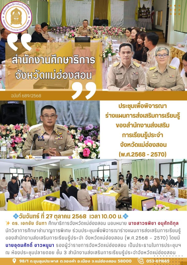 ✨ ดร. เอกชัย จันทา ศึกษาธิการจังหวัดแม่ฮ่องสอน มอบหมาย นางสาวรพิชา อนุศักดิกุล นักวิชาการศึกษาชำนาญการพิเศษ ร่วมประชุมเพื่อพิจารณาร่างแผนการส่งเสริมการเรียนรู้ของสำนักงานส่งเสริมการเรียนรู้ประจำ จังหวัดแม่ฮ่องสอน (พ.ศ.2568 – 2570) โดยมี นายอุดมศักดิ์ ขาวหนูนา รองผู้ว่าราชการจังหวัดแม่ฮ่องสอน เป็นประธานในการประชุมฯ ณ ห้องประชุมปลายดอย ชั้น 3 สำนักงานส่งเสริมการเรียนรู้ประจำจังหวัดแม่ฮ่องสอน