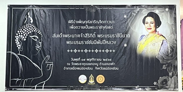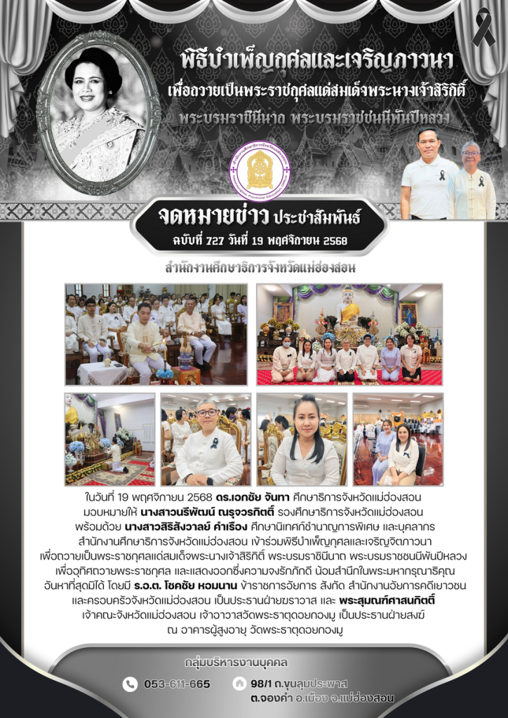 ในวันที่ 19 พฤศจิกายน 2568 ดร.เอกชัย จันทา ศึกษาธิการจังหวัดแม่ฮ่องสอน มอบหมายให้ นางสาวนรีพัฒน์ ณรุจวรกิตติ์ รองศึกษาธิการจังหวัดแม่ฮ่องสอน พร้อมด้วยนางสาวสิริสังวาลย์ คำเรือง ศึกษานิเทศก์ชำนาญการพิเศษ และบุคลากรสำนักงานศึกษาธิการจังหวัดแม่ฮ่องสอน เข้าร่วมพิธีบำเพ็ญกุศลและเจริญจิตภาวนาเพื่อถวายเป็นพระราชกุศลแด่สมเด็จพระนางเจ้าสิริกิติ์ พระบรมราชินีนาถ พระบรมราชชนนีพันปีหลวง เพื่ออุทิศถวายพระราชกุศล และแสดงออกซึ่งความจงรักภักดี น้อมสำนึกในพระมหากรุณาธิคุณอันหาที่สุดมิได้ โดยมี ร.อ.ต. โชคชัย หอมนาน ข้าราชการอัยการ สังกัด สำนักงานอัยการคดีเยาวชนและครอบครัวจังหวัดแม่ฮ่องสอน เป็นประธานฝ่ายฆราวาส และพระสุมณฑ์ศาสนกิตติ์ เจ้าคณะจังหวัดแม่ฮ่องสอน เจ้าอาวาสวัดพระธาตุดอยกองมู เป็นประธานฝ่ายสงฆ์ ณ อาคารผู้สูงอายุ วัดพระธาตุดอยกองมู