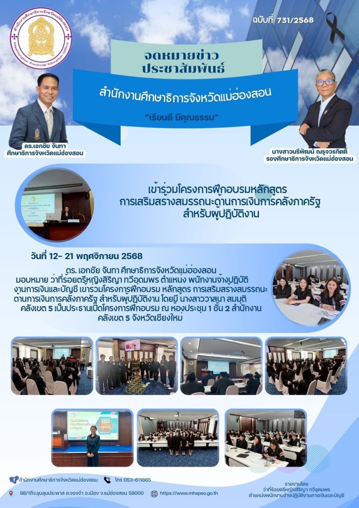 วันที่ 12- 21 พฤศจิกายน 2568 ดร. เอกชัย จันทา ศึกษาธิการจังหวัดแม่ฮ่องสอน มอบหมาย ว่าที่ร้อยตรีหญิงสิริญา ทวีอุดมพร ตำแหน่ง พนักงานจ้างปฏิบัติงานการเงินและบัญชี เข้าร่วมโครงการฝึกอบรม หลักสูตร การเสริมสร้างสมรรถนะด้านการเงินการคลังภาครัฐ สำหรับผู้ปฏิบัติงาน โดยมี นางสาววาสนา สมมุติ คลังเขต 5 เป็นประธานเปิดโครงการฝึกอบรม ณ ห้องประชุม 1 ชั้น 2 สำนักงานคลังเขต 5 จังหวัดเชียงใหม่