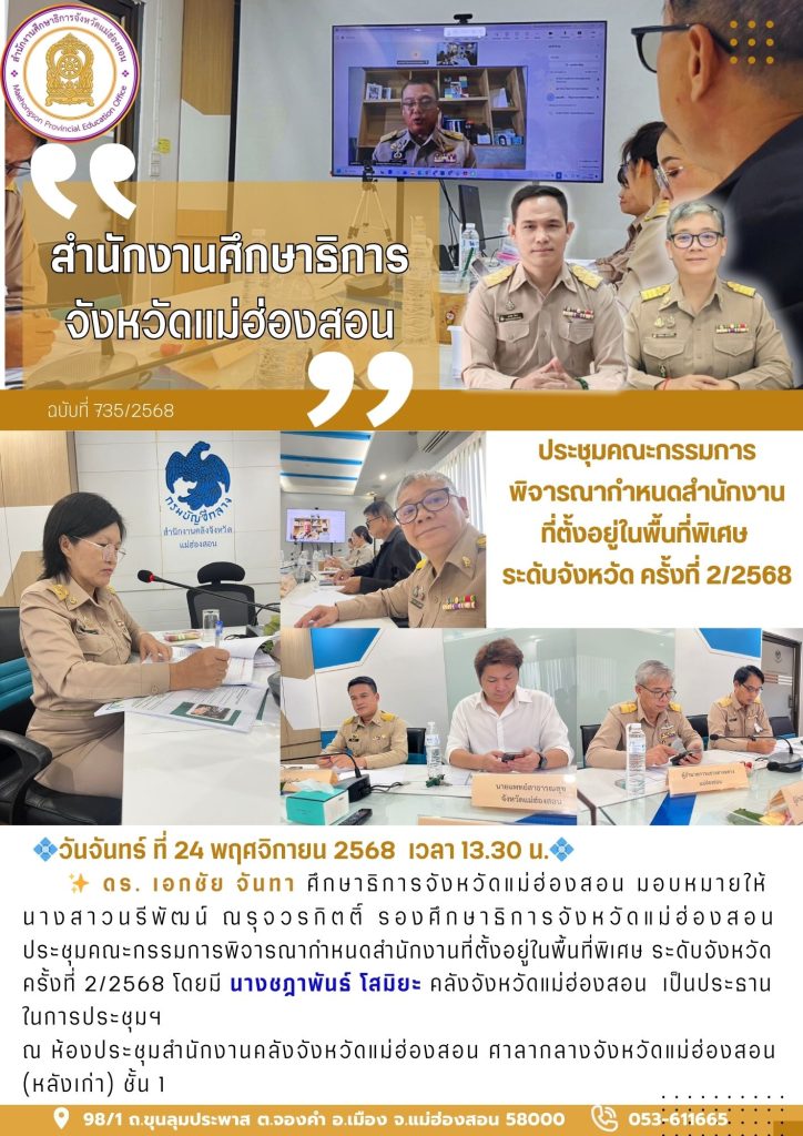ประชุมคณะกรรมการพิจารณากำหนดสำนักงานที่ตั้งอยู่ในพื้นที่พิเศษ ระดับจังหวัด ครั้งที่ 2/2568 โดยมี นางชฎาพันธ์ โสมิยะ คลังจังหวัดแม่ฮ่องสอน เป็นประธานในการประชุมฯ ณ ห้องประชุมสำนักงานคลังจังหวัดแม่ฮ่องสอน ศาลากลางจังหวัดแม่ฮ่องสอน