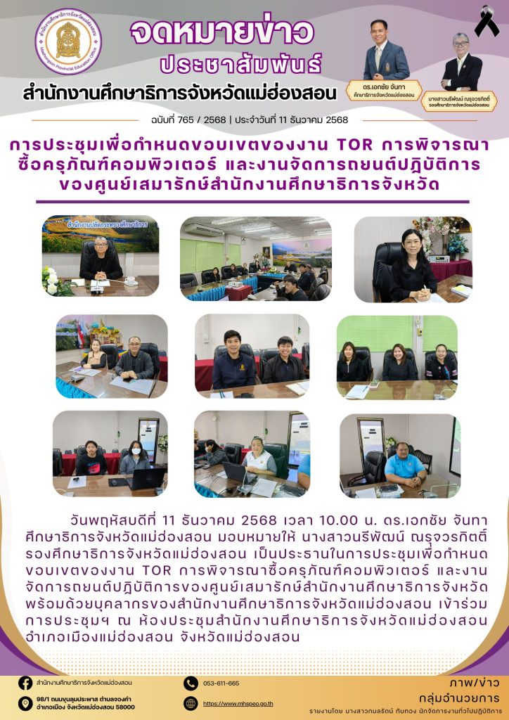 วันพฤหัสบดีที่ 11 ธันวาคม 2568 เวลา 10.00 น. ดร.เอกชัย จันทา ศึกษาธิการจังหวัดแม่ฮ่องสอน มอบหมายให้ นางสาวนรีพัฒน์ ณรุจวรกิตติ์ รองศึกษาธิการจังหวัดแม่ฮ่องสอน เป็นประธานในการประชุมเพื่อกำหนดขอบเขตของงาน TOR การพิจารณาซื้อครุภัณฑ์คอมพิวเตอร์ และงานจัดการถยนต์ปฏิบัติการของศูนย์เสมารักษ์สำนักงานศึกษาธิการจังหวัด พร้อมด้วยบุคลากรของสำนักงานศึกษาธิการจังหวัดแม่ฮ่องสอน เข้าร่วมการประชุมฯ ณ ห้องประชุมสำนักงานศึกษาธิการจังหวัดแม่ฮ่องสอน อำเภอเมืองแม่ฮ่องสอน จังหวัดแม่ฮ่องสอน