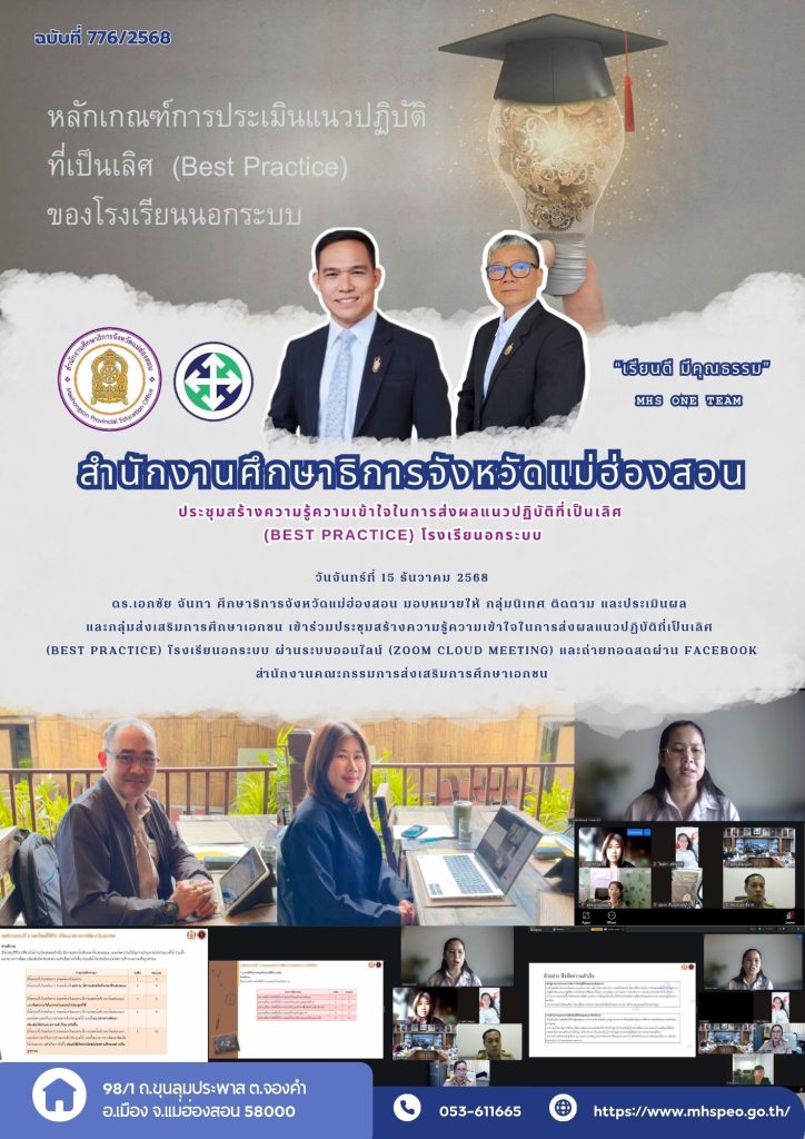 ดร.เอกชัย จันทา ศึกษาธิการจังหวัดแม่ฮ่องสอน มอบหมายให้ กลุ่มนิเทศ ติดตาม และประเมินผล และกลุ่มส่งเสริมการศึกษาเอกชน เข้าร่วมประชุมสร้างความรู้ความเข้าใจในการส่งผลแนวปฏิบัติที่เป็นเลิศ (Best Practice) โรงเรียนอกระบบ ผ่านระบบออนไลน์ (Zoom Cloud Meeting) และถ่ายทอดสดผ่าน Facebook สำนักงานคณะกรรมการส่งเสริมการศึกษาเอกชน