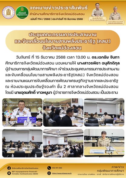 วันจันทร์ ที่ 15 ธันวาคม 2568 เวลา 13.00 น.ดร.เอกชัย จันทา ศึกษาธิการจังหวัดแม่ฮ่องสอน มอบหมายให้ นางสาวรพิชา อนุศักดิกุล ผู้อำนวยการกลุ่มพัฒนาการศึกษา เข้าร่วมประชุมคณะกรรมการประสานงานและขับเคลื่อนนโยบายสานพลังประชารัฐ(คสป.) จังหวัดแม่ฮ่องสอน และรายงานแผนการขับเคลื่อนการพัฒนาเศรษฐกิจฐานรากและประชารัฐ ณ ห้องประชุมประดิษฐ์จองคำ ชั้น 2 ศาลากลางจังหวัดแม่ฮ่องสอน โดยมี นายอุดมศักดิ์ ขาวหนูนา ผู้ว่าราชการจังหวัดแม่ฮ่องสอน เป็นประธาน