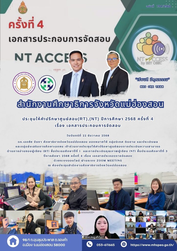 ดร.เอกชัย จันทา ศึกษาธิการจังหวัดแม่ฮ่องสอน มอบหมายให้ กลุ่มนิเทศ ติดตาม และประเมินผล และกลุ่มส่งเสริมการศึกษาเอกชน เข้าร่วมการประชุมให้คำปรึกษาศูนย์สอบการประเมินความสามารถด้านการอ่านของผู้เรียน (RT) ชั้นประถมศึกษาปีที่ 1 และการประเมินคุณภาพผู้เรียน (NT) ชั้นประถมศึกษาปีที่ 3 ปีการศึกษา 2568 ครั้งที่ 3 เรื่อง เอกสารประกอบการจัดสอบ ด้วยระบบออนไลน์ ผ่านระบบ Zoom Meeting ณ ห้องประชุมสำนักงานศึกษาธิการจังหวัดแม่ฮ่องสอน